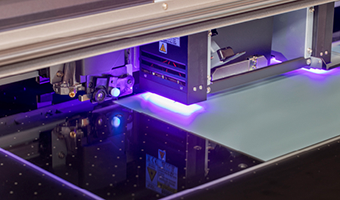 Fast-drying printing method using ultraviolet lights to cure inks which results in a gloss finish.